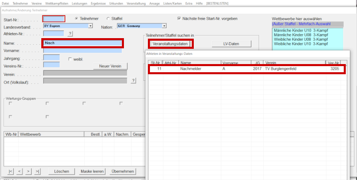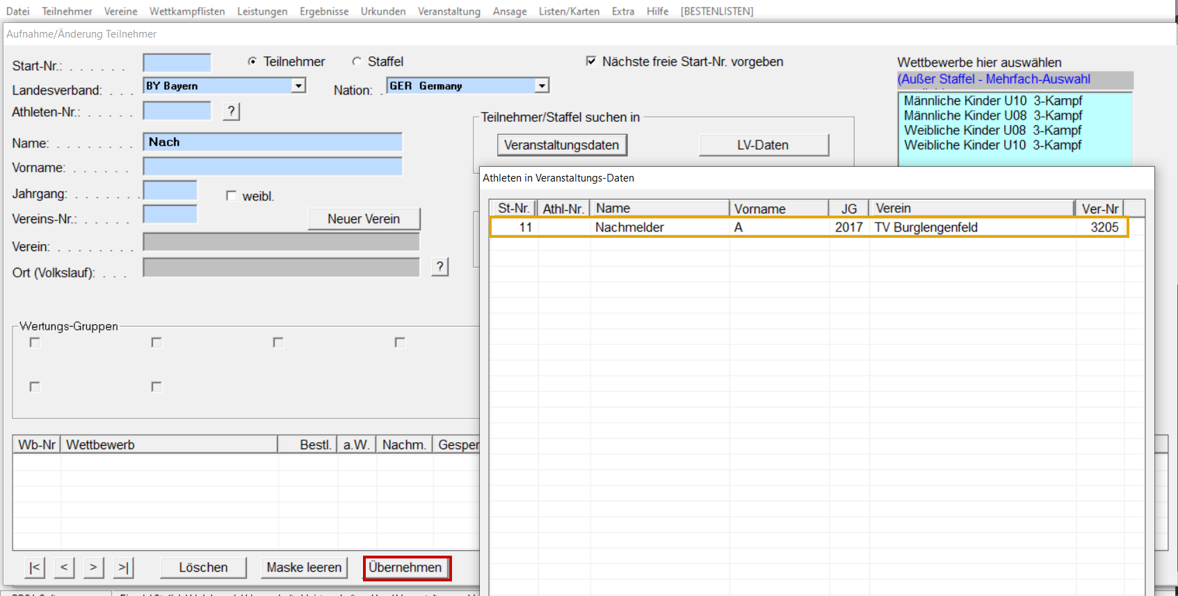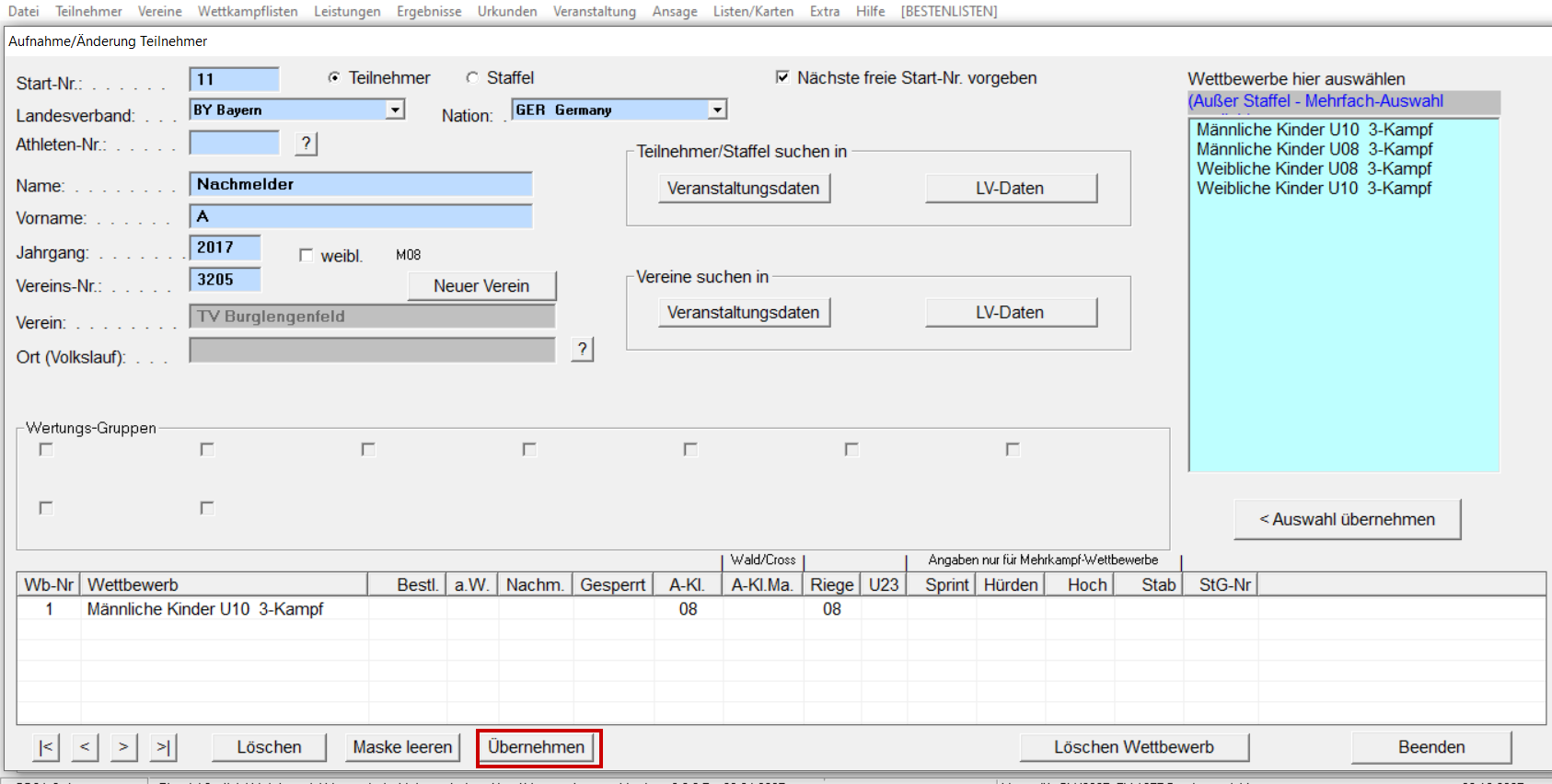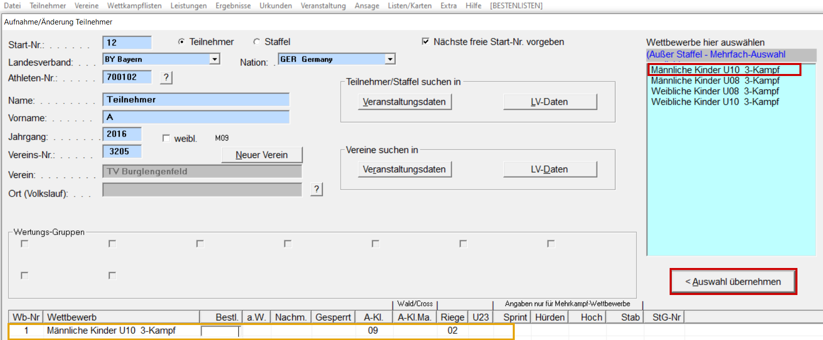 Unter Wettbewerbe "Männliche Kinder U10 3-Kampf" markieren und mit "Auswahl übernehmen" abschließen. Der Wettbewerb ist für diesen Athleten angelegt (siehe gelbe Umrandung).
