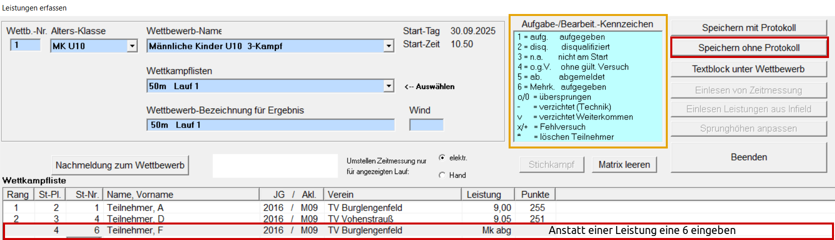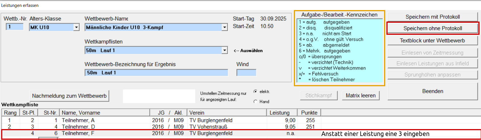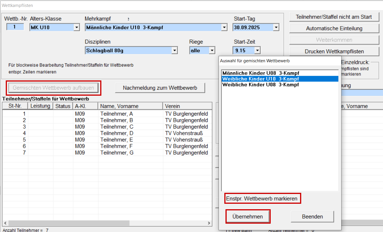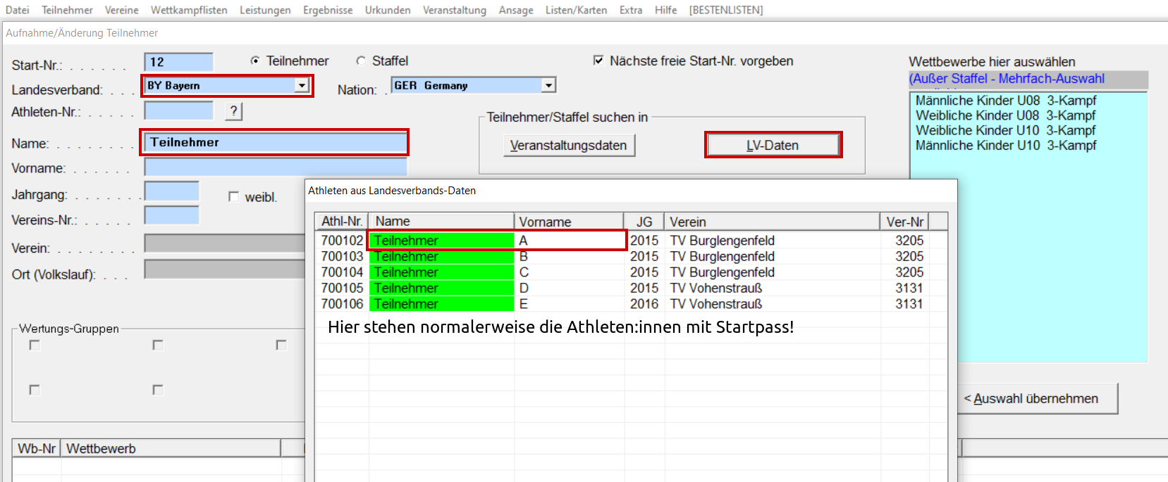 Unter Wettbewerbe "Männliche Kinder U10 3-Kampf" markieren und mit "Auswahl übernehmen" abschließen. Der Wettbewerb ist für diesen Athleten angelegt (siehe gelbe Umrandung).