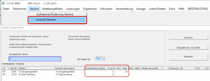Unter "Ansicht Vereine" werden die Vereine, die Org-Gebühren und die Anzahl der Teilnehmer angezeigt.