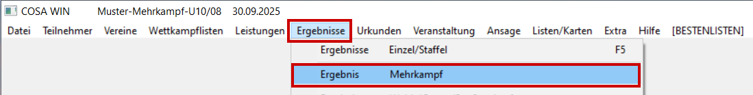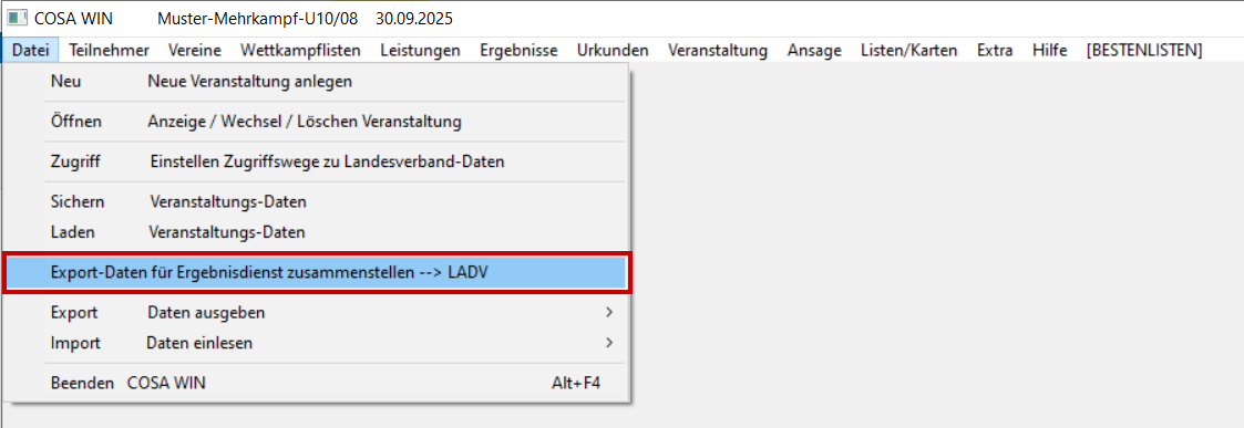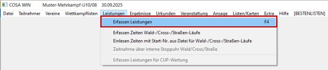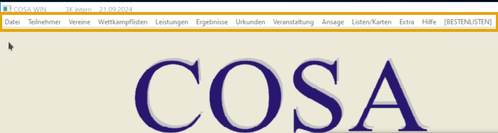 • Datei • Teilnehmer • Vereine • Wettkampflisten • Leistungen • Ergebnisse • Urkunden • Veranstaltung • Ansage • Listen/Karten • Extras