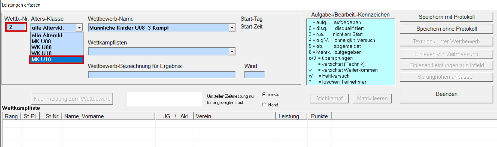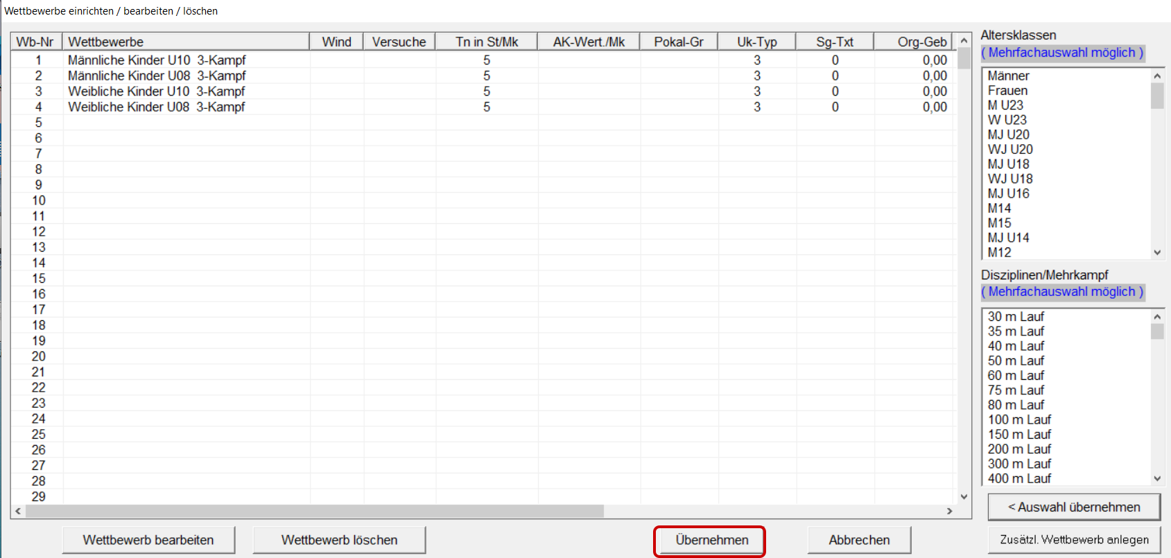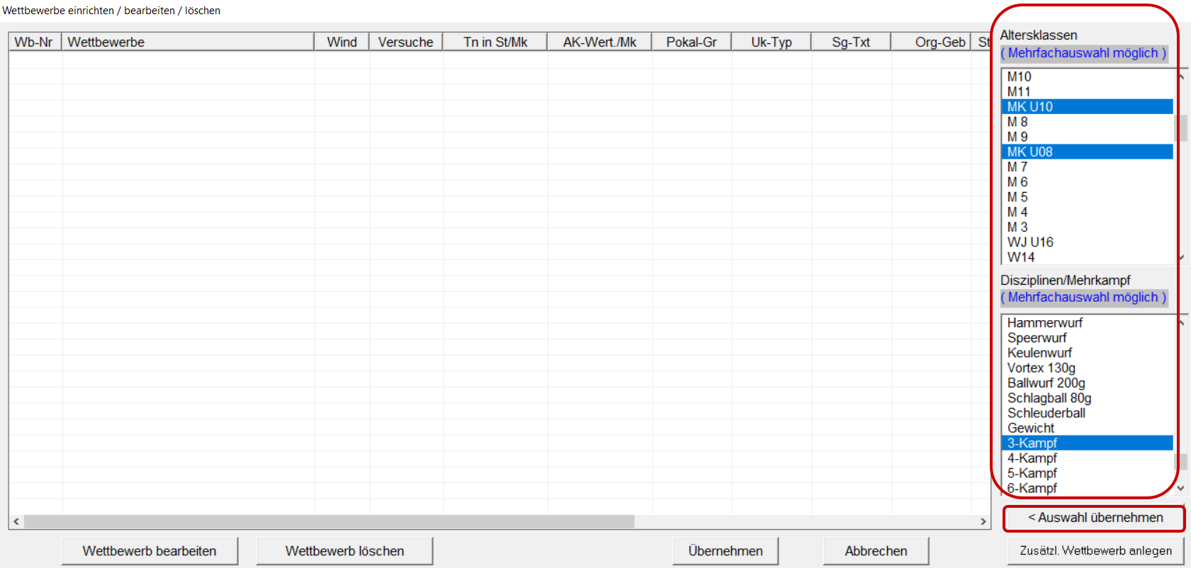 Zuerst alle gewünschten Altersklassen und dann die Wettbewerbe (z.B. 3-Kampf) markieren.