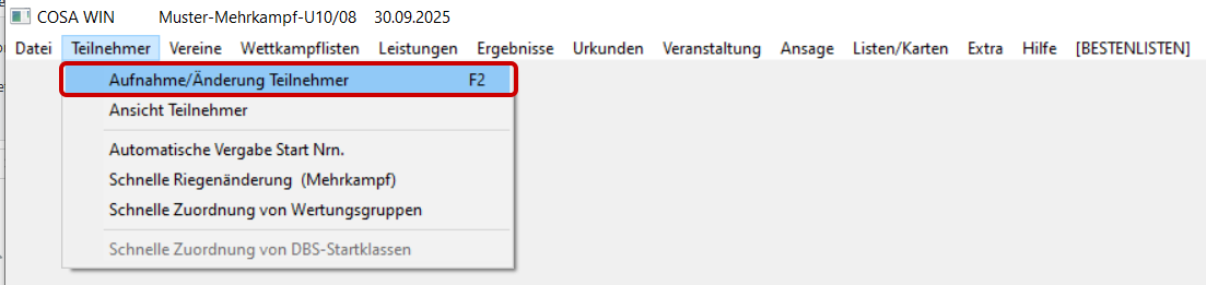 Teilnehmer / "Aufnahme/Änderung Teilnehmer" aufrufen, alternativ F2 drücken.