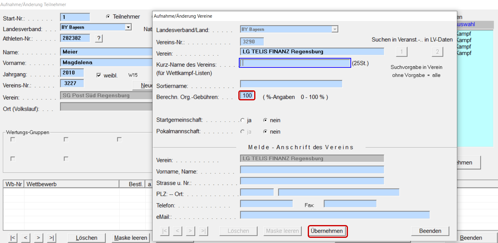 Wird ein Teilnehmer mit einer anderen Vereinsnummer (z.B. 3131) angelegt, muss der Verein noch überarbeitet werden! siehe Verein