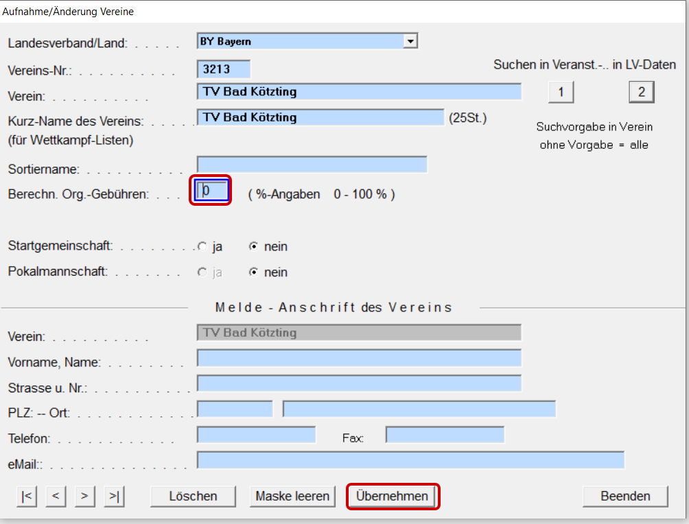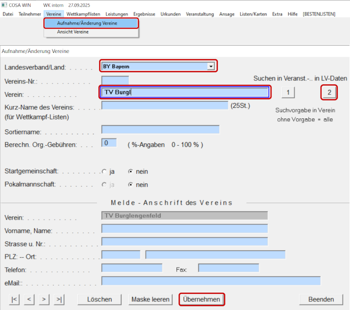 Verein manuell erfassen, dazu "Vereine / Aufnahme/Änderung Vereine" öffnen.
