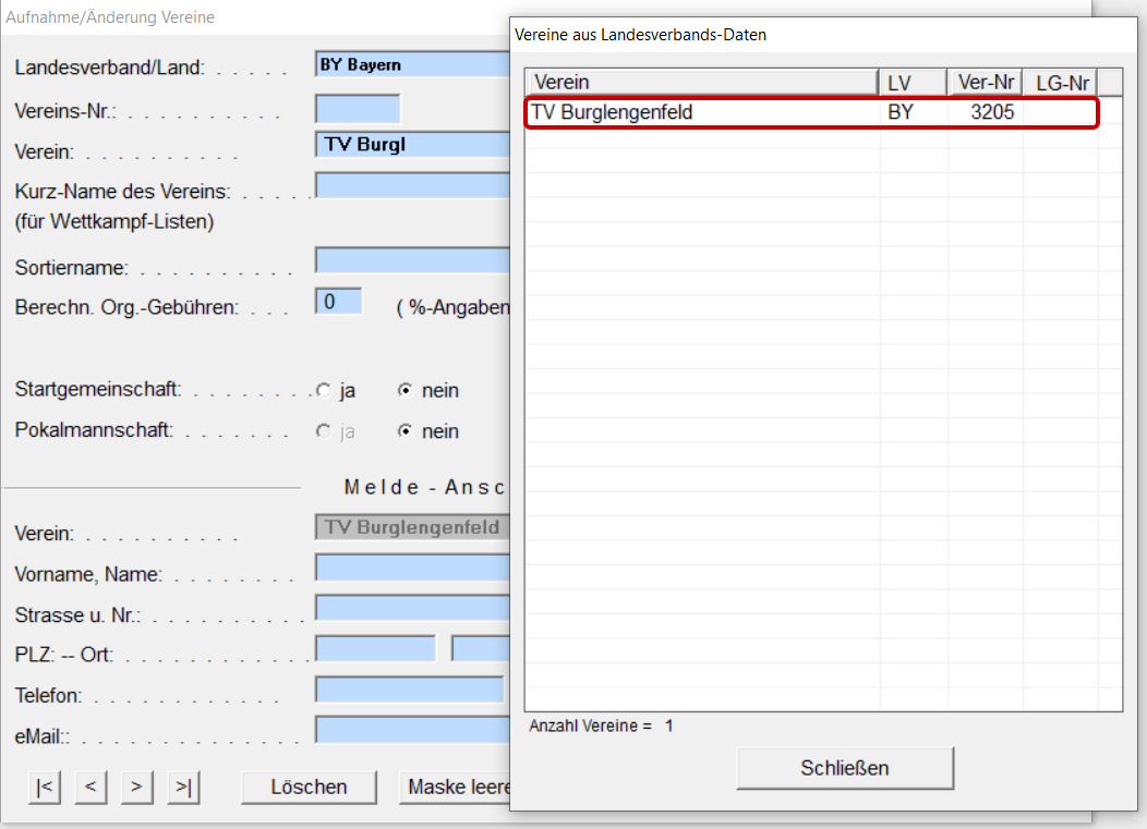 Den gewünschten Verein mit Doppelklick übernehmen.