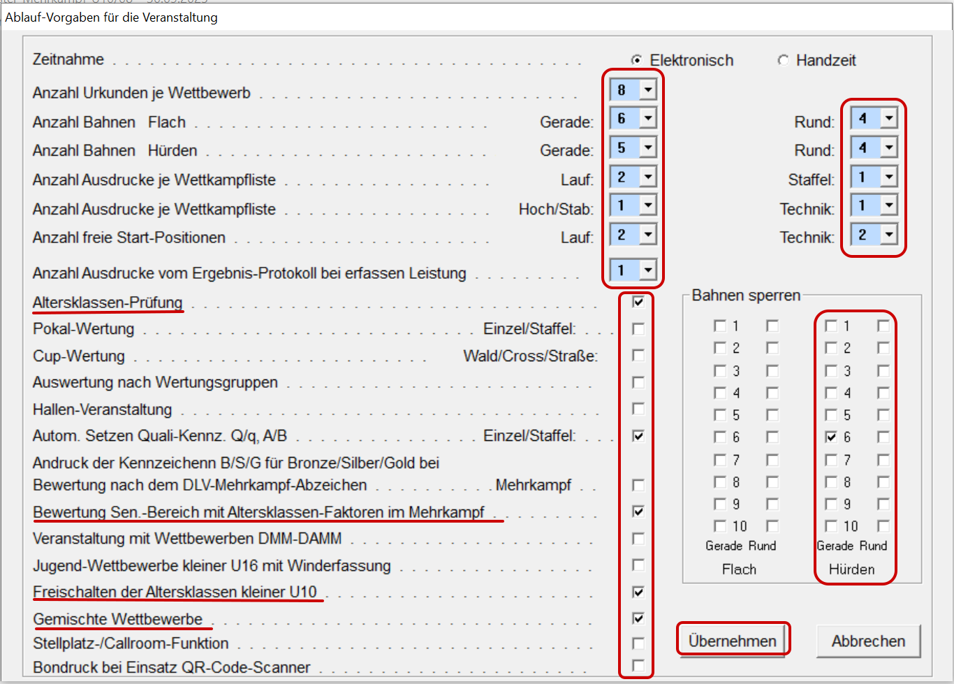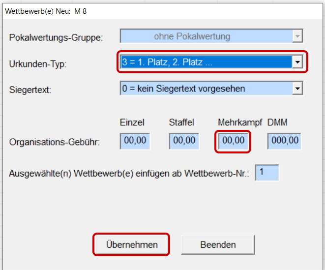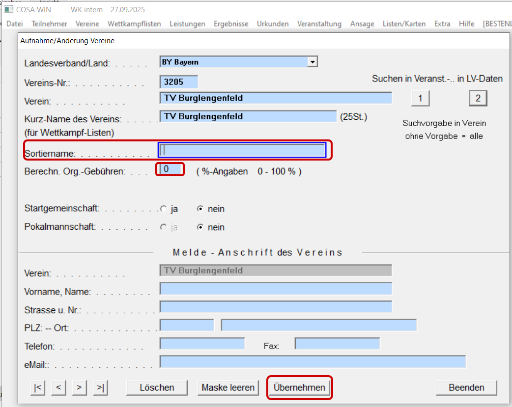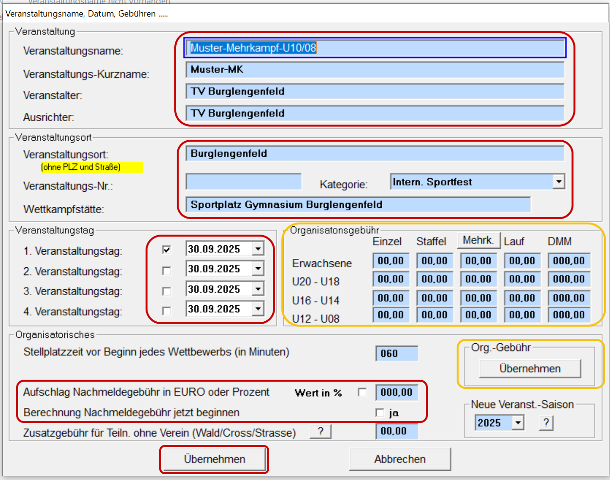 Felder mit roter Umrandung müssen ausgefüllt (gelb umrandete Felder können ausgefüllt werden, ist aber auch noch bei den Wettbewerben möglich). Weiter mit "Übernehmen"