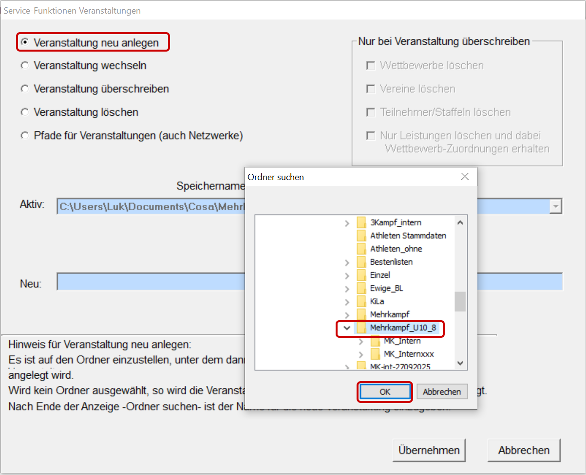 Ordner festlegen, wo der Unterordner angelegt werden soll!
