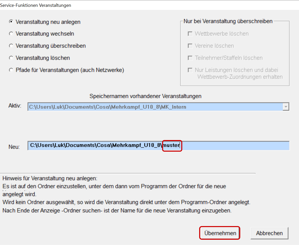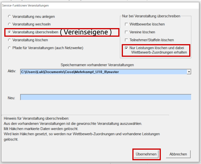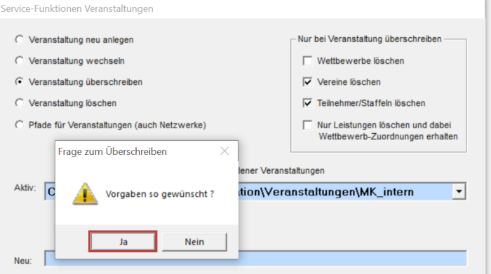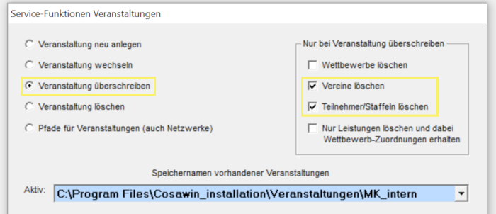 Veranstaltung überschreiben markieren und Vereine / Teilnehmer löschen auswählen.