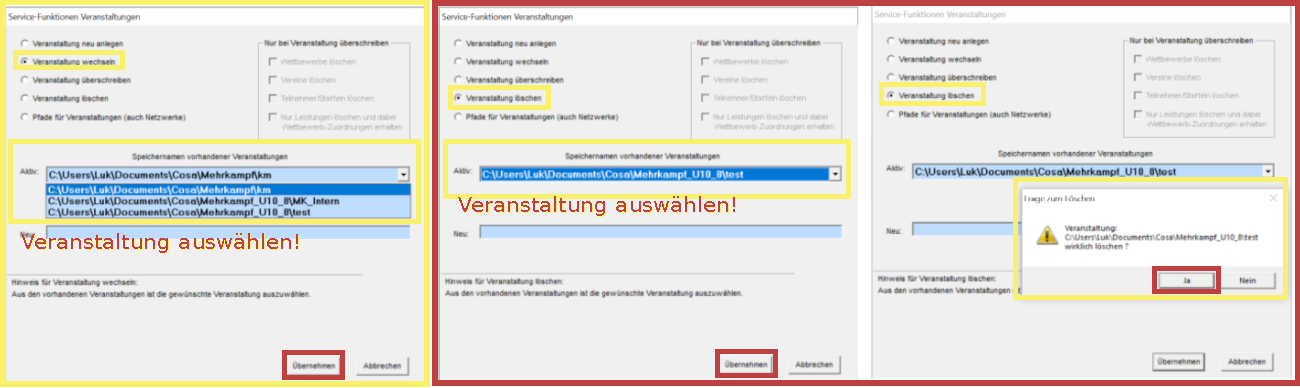 Linkes Bild: Veranstaltung wechseln. Bild mit roter Umrandung: Veranstaltung löschen.