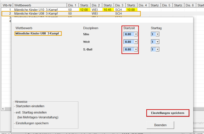 Wettbewerb auswählen und in Startz. klicken. Die Startzeiten eingeben und mit "Einstellungen speichern" abschließen.