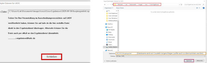 Als erstes erscheint ein Hinweis und nach "Schließen" die Pfad-Angabe wo die ZIP-Datei gespeichert wird. Pfad evtl. ändern und "Speichern"