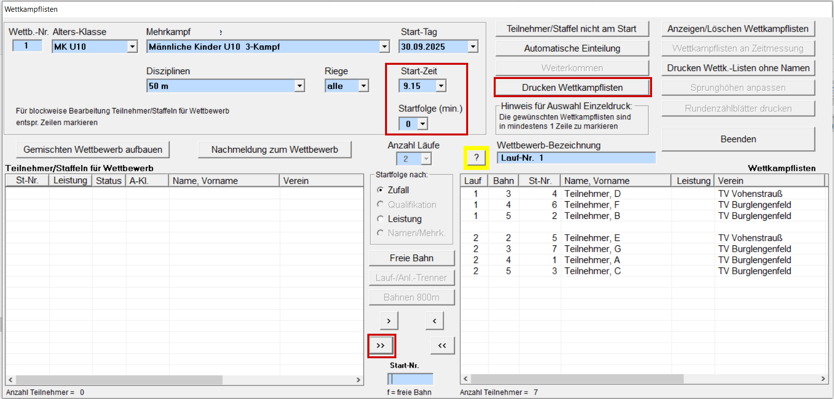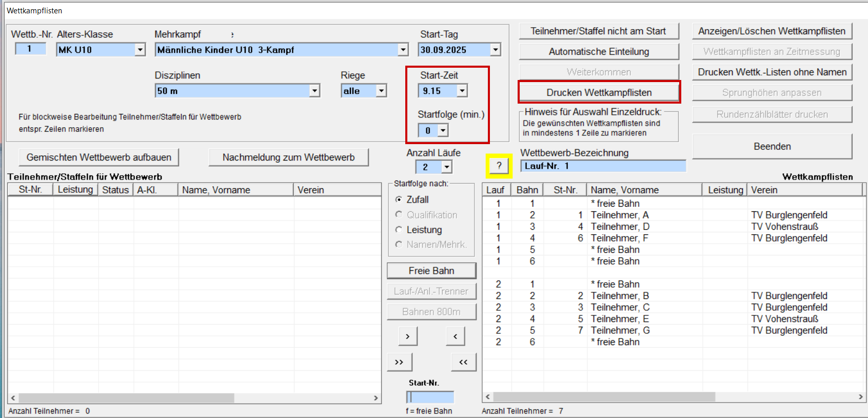 Startfolge und Startzeit festlegen dann "Drucken Wettkampflisten" anklicken.