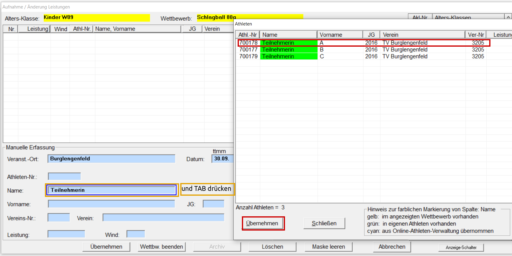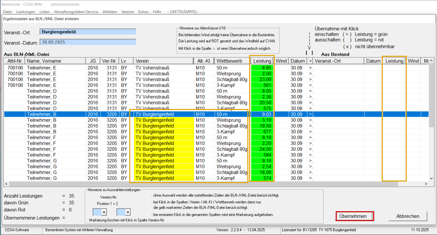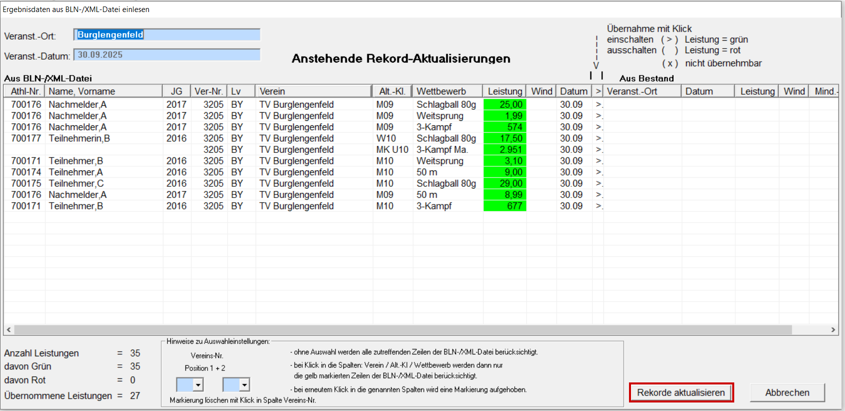 Unter Datei / Import / Daten einlesen "Bestendaten aus Veranstaltung" auswählen. Datei suchen und öffnen. Hinweis mit OK schließen. TV Burglengenfeld suchen und auf den Namen klicken (es sind nun alle Athleten des Vereins gelb hinterlegt). Ist die Leistung grün, sind noch keine besseren Leistung vorhanden, ist die Leistung rot hinterlegt ist rechts bereits eine bessere Leistung vorhanden und wird darum zur Übernahme gesperrt. Mit "Übernehmen" abschließen. Hinweis mit OK schließen. Rekord-Meldung mit "Rekorde aktualisieren" übernehmen.