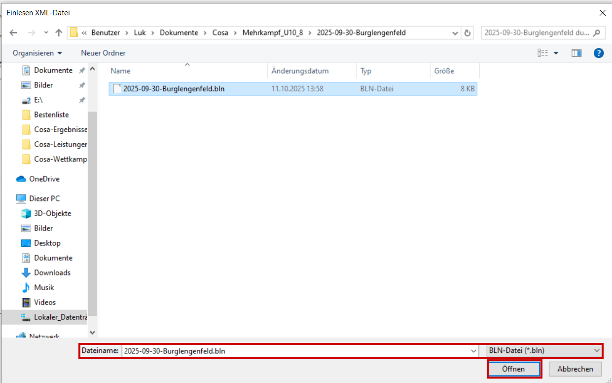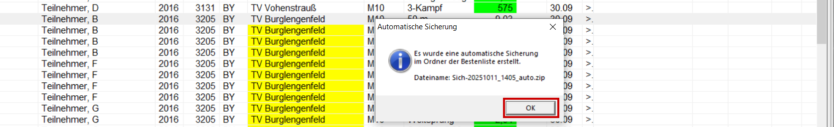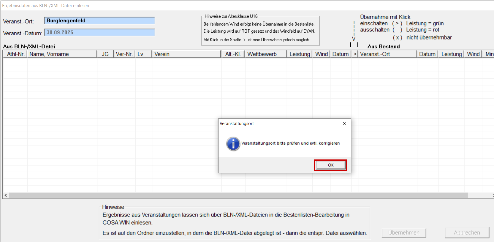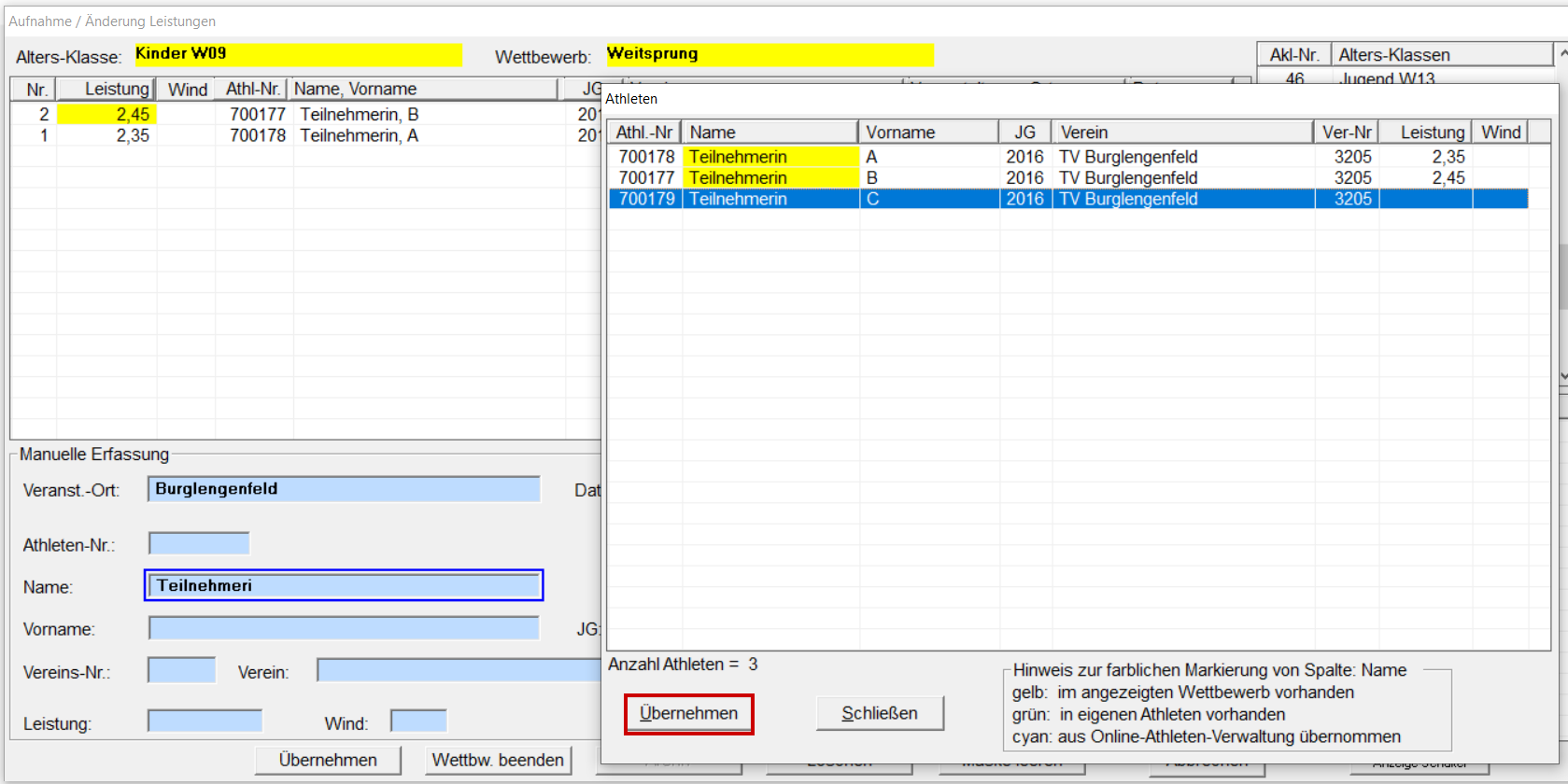 Unter Datei / Import / Daten einlesen "Bestendaten aus Veranstaltung" auswählen. Datei suchen und öffnen. Hinweis mit OK schließen. TV Burglengenfeld suchen und auf den Namen klicken (es sind nun alle Athleten des Vereins gelb hinterlegt). Ist die Leistung grün, sind noch keine besseren Leistung vorhanden, ist die Leistung rot hinterlegt ist rechts bereits eine bessere Leistung vorhanden und wird darum zur Übernahme gesperrt. Mit "Übernehmen" abschließen. Hinweis mit OK schließen. Rekord-Meldung mit "Rekorde aktualisieren" übernehmen.