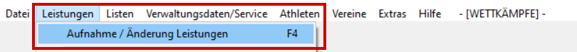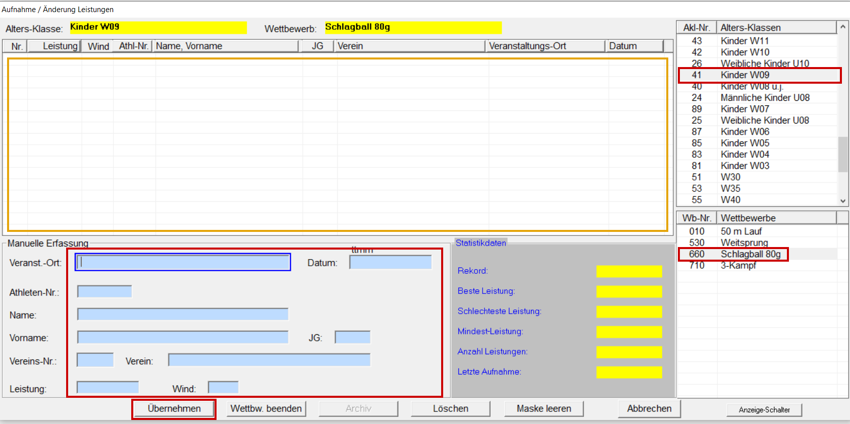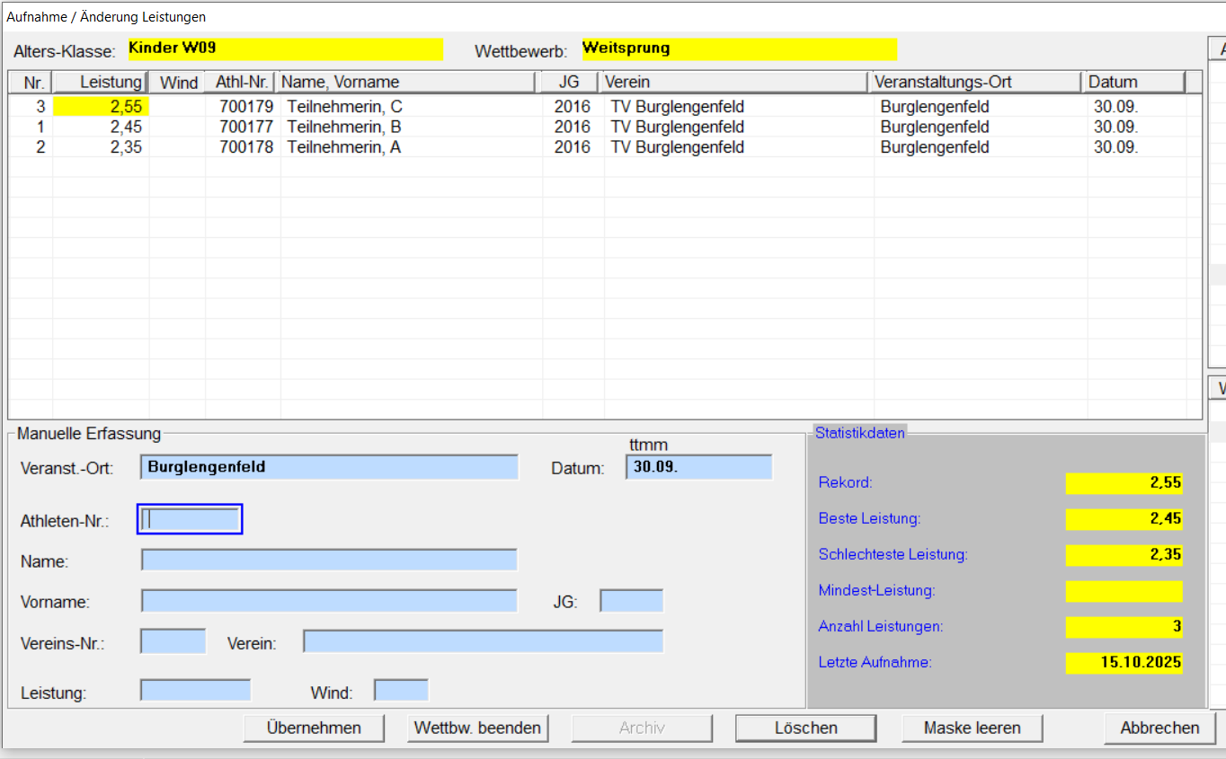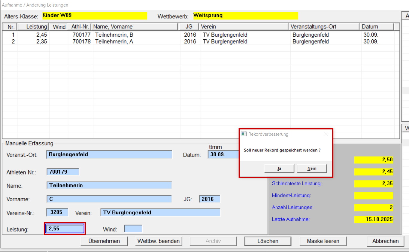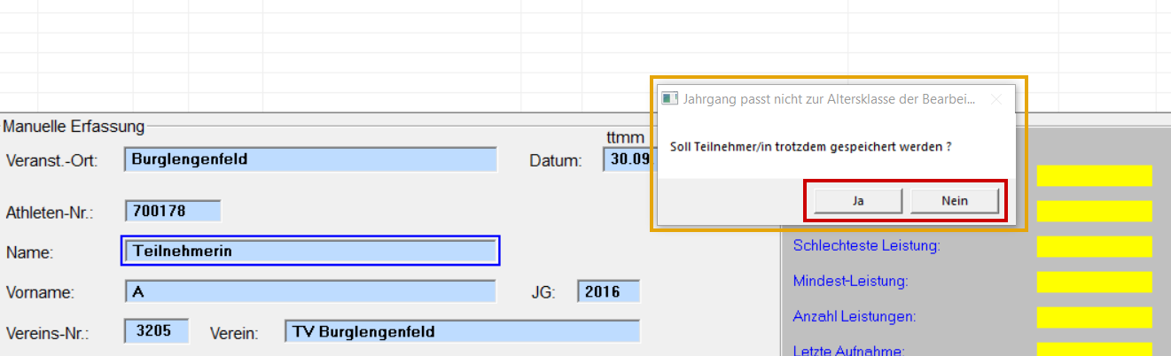 Leistungen / Aufnahme... aufrufen oder " F4 " drücken. 1. Altersklasse / Disziplin auswählen. 2. Die Felderunter "Manuelle Erfassung" ausfüllen (dabei die TAB-Taste benützen). Schreibt man ins Name-Feld den Namen oder Teile des Namen und drückt die "TAB" Taste erscheint ein neues Fenster mit Athleten aus der Stammdaten-Datei oder der Athleten-Datei der Bestenliste. Gewünschten Athleten mit Doppelklick übernehmen. Ist der Athlet:in noch nicht vorhanden, Fenster schließen und manuell eingeben! Stimmt der Jahrgang nicht zur Altersklasse, kommt folgende Meldung. Ist der Athlet:in höher gestartet dann mit "Ja" übernehmen, ansonsten mit "Nein". Athleten:innen mit bereits erfassten Leistungen, sind in der Stammdatenliste gelb hinterlegt. Die Rekordmeldung mit "Ja" schließen