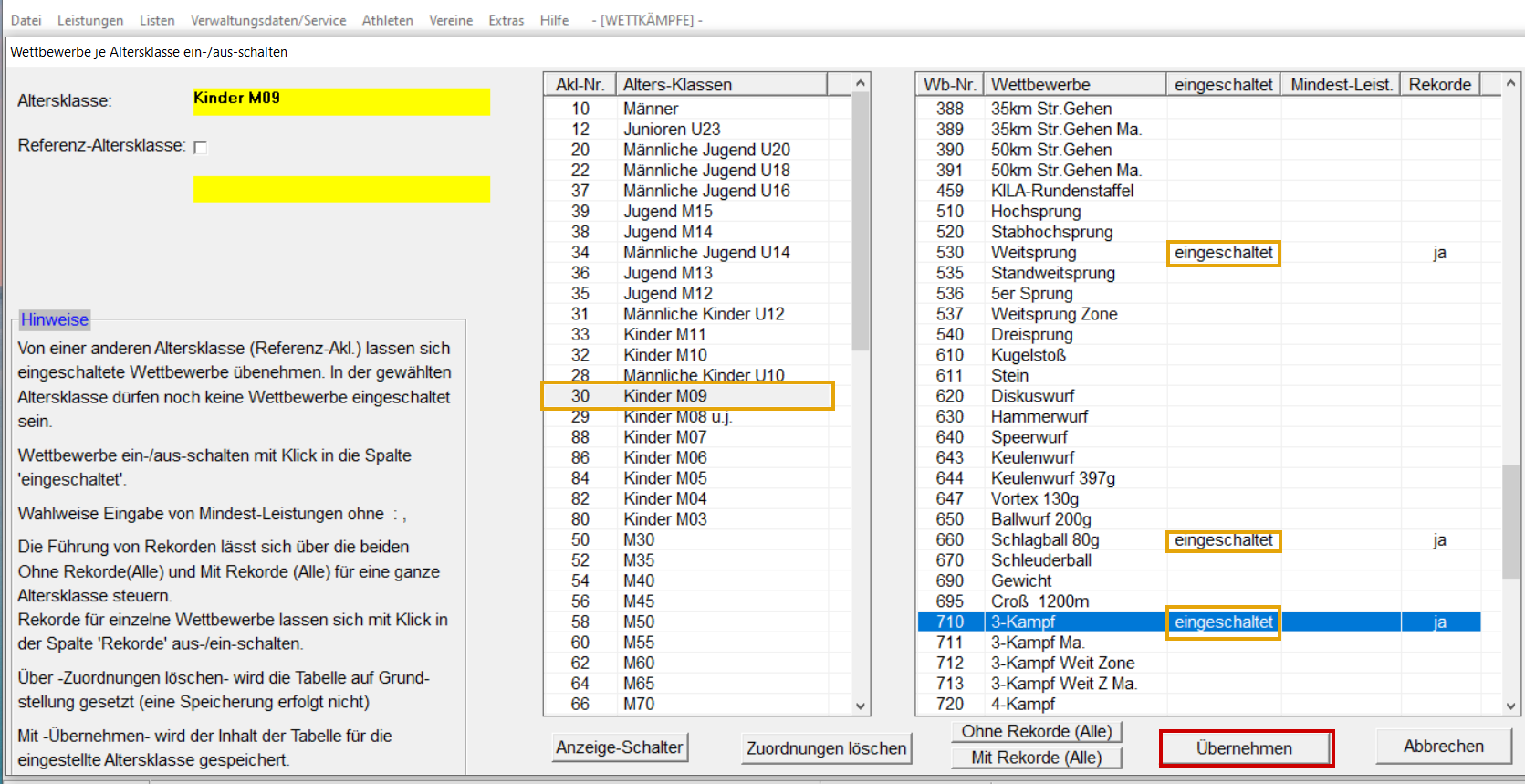 Damit man Leistungen in der Bestenliste sieht, müssen zuvor die Wettbewerbe für jede Altersklasse zugeordnet wurden: Altersklasse auswählen, dann bei der Disziplinzeile in das Feld "eingeschaltet" klicken und es erscheint im Feld eingeschaltet. Eingeschaltet werden bei M/W 09-03, der 50m Lauf, Weitsprung und der Schlagball. Eingeschaltet werden für die M/W Kinder U10, 3-Kampf Ma. und evtl. 4x50m. Übernehmen nicht vergessen!