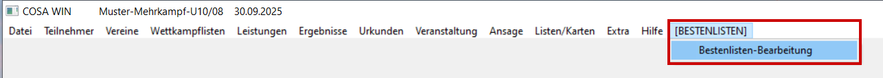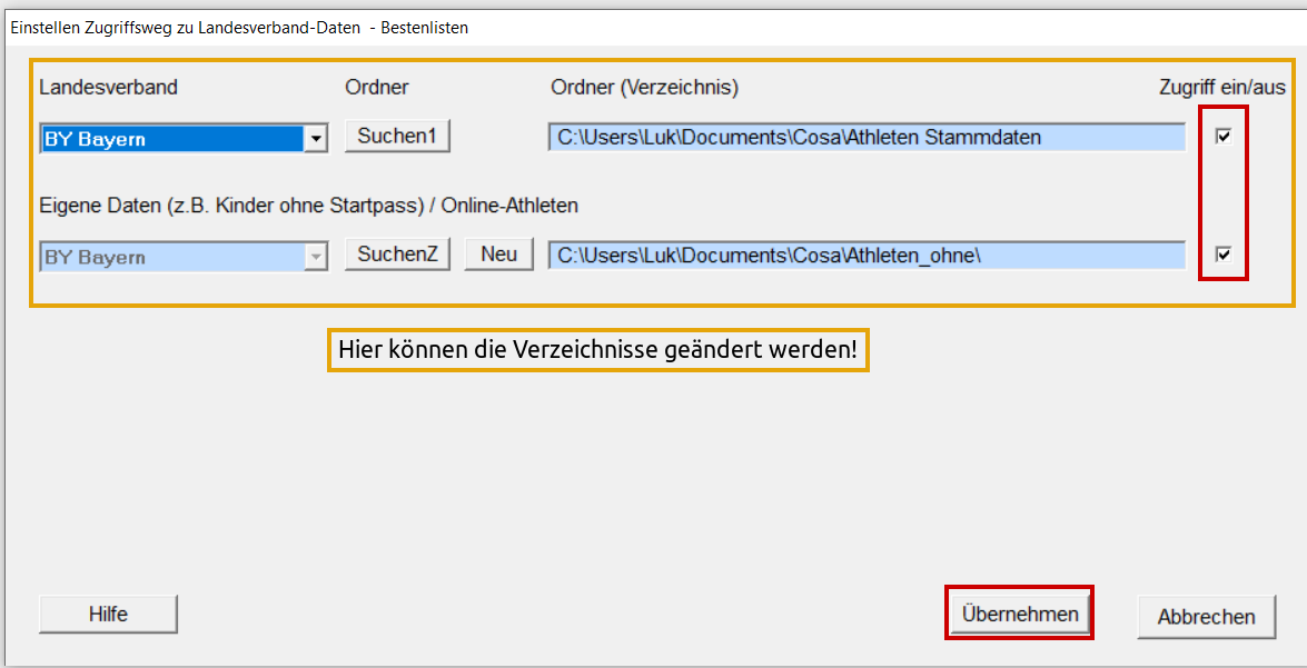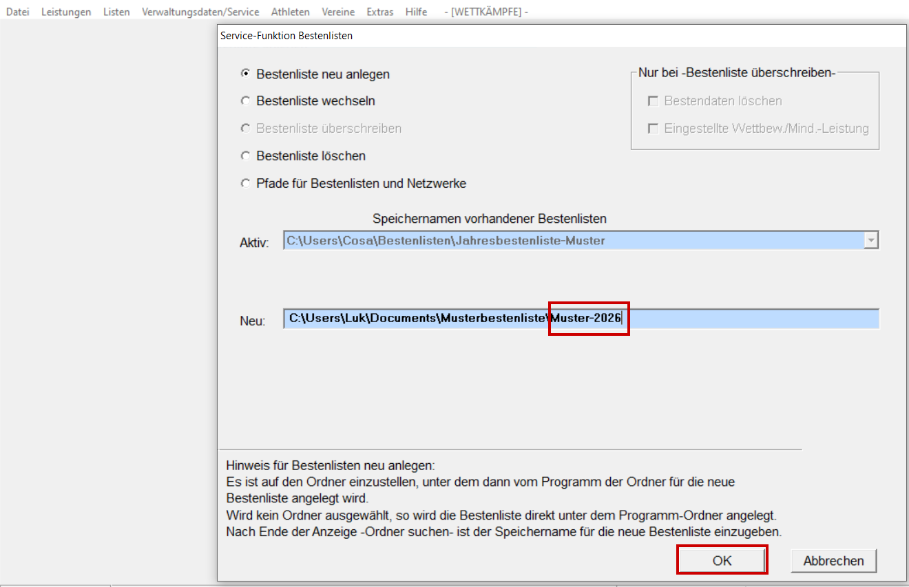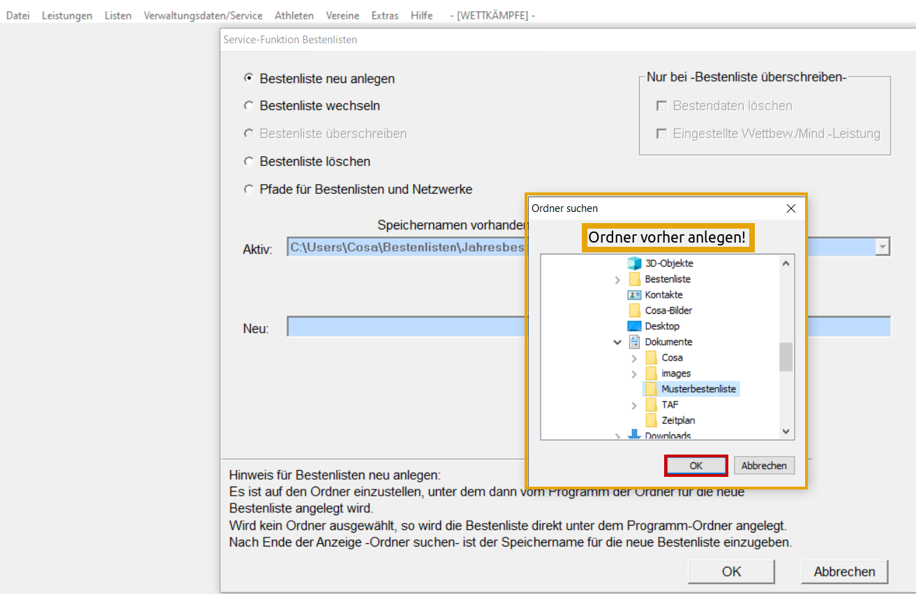 Ordner auswählen und mit OK abschließen. Name der Bestenliste eingeben und mit OK abschließen. Felder in gelber Umrandung ausfüllen und "Übernehmen" Änderungsmöglichkeiten für die Stammdaten-Ordner. "Übernehmen" Felder in gelber Umrandung ausfüllen und "Übernehmen" Bestenliste ist nun angelegt.