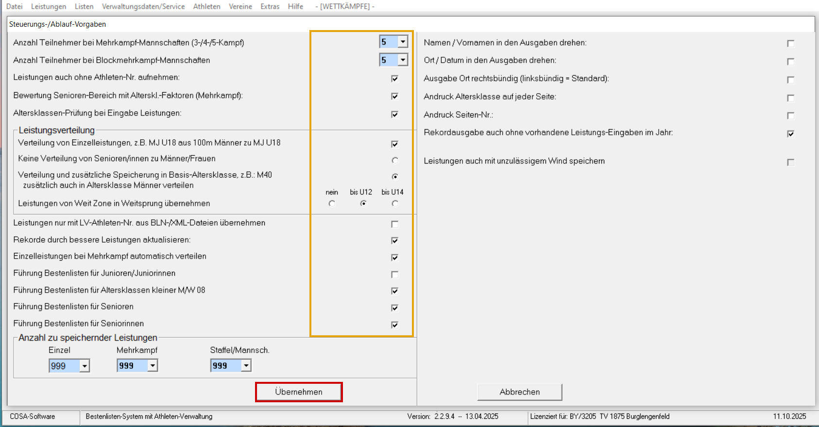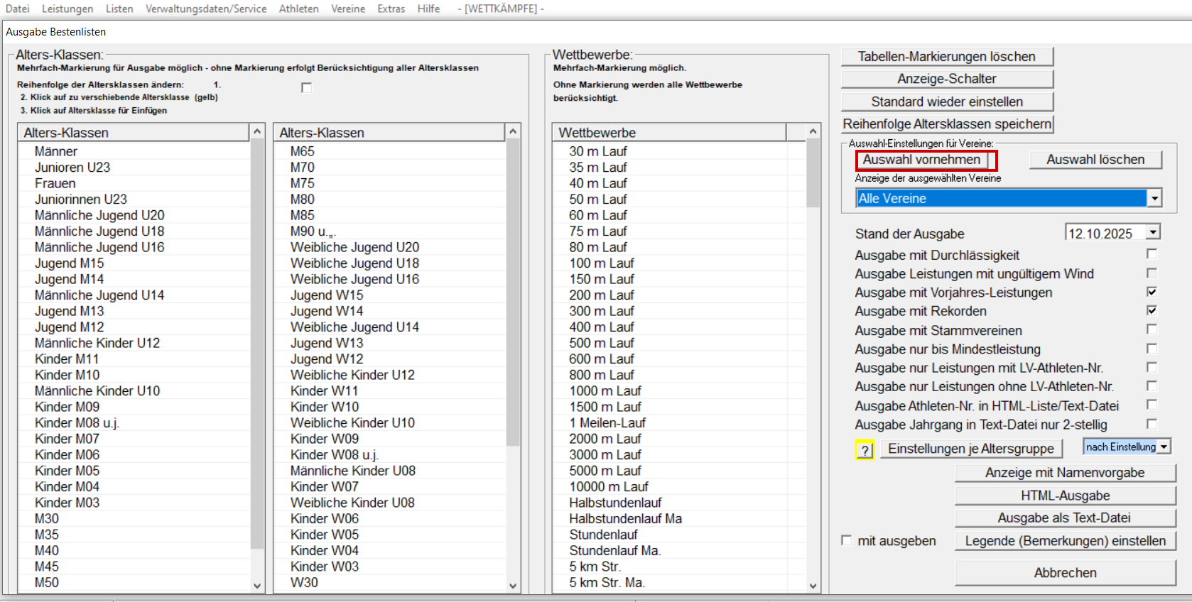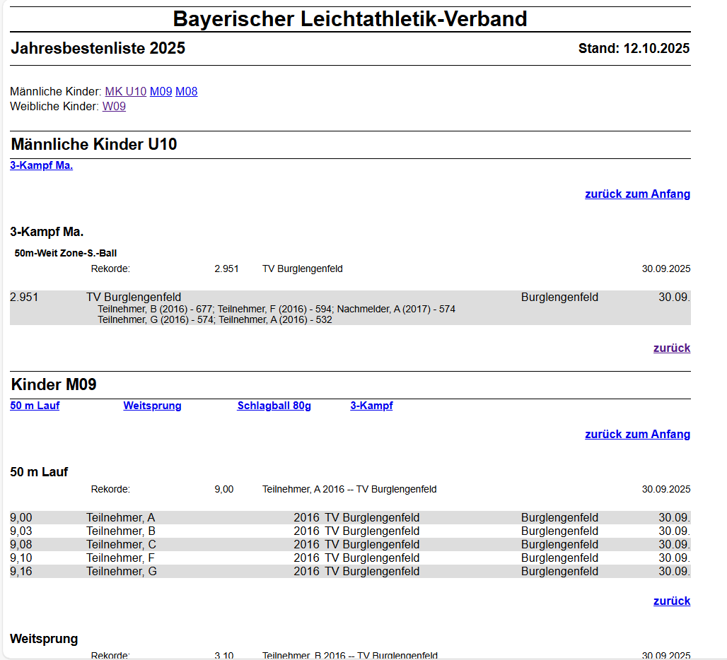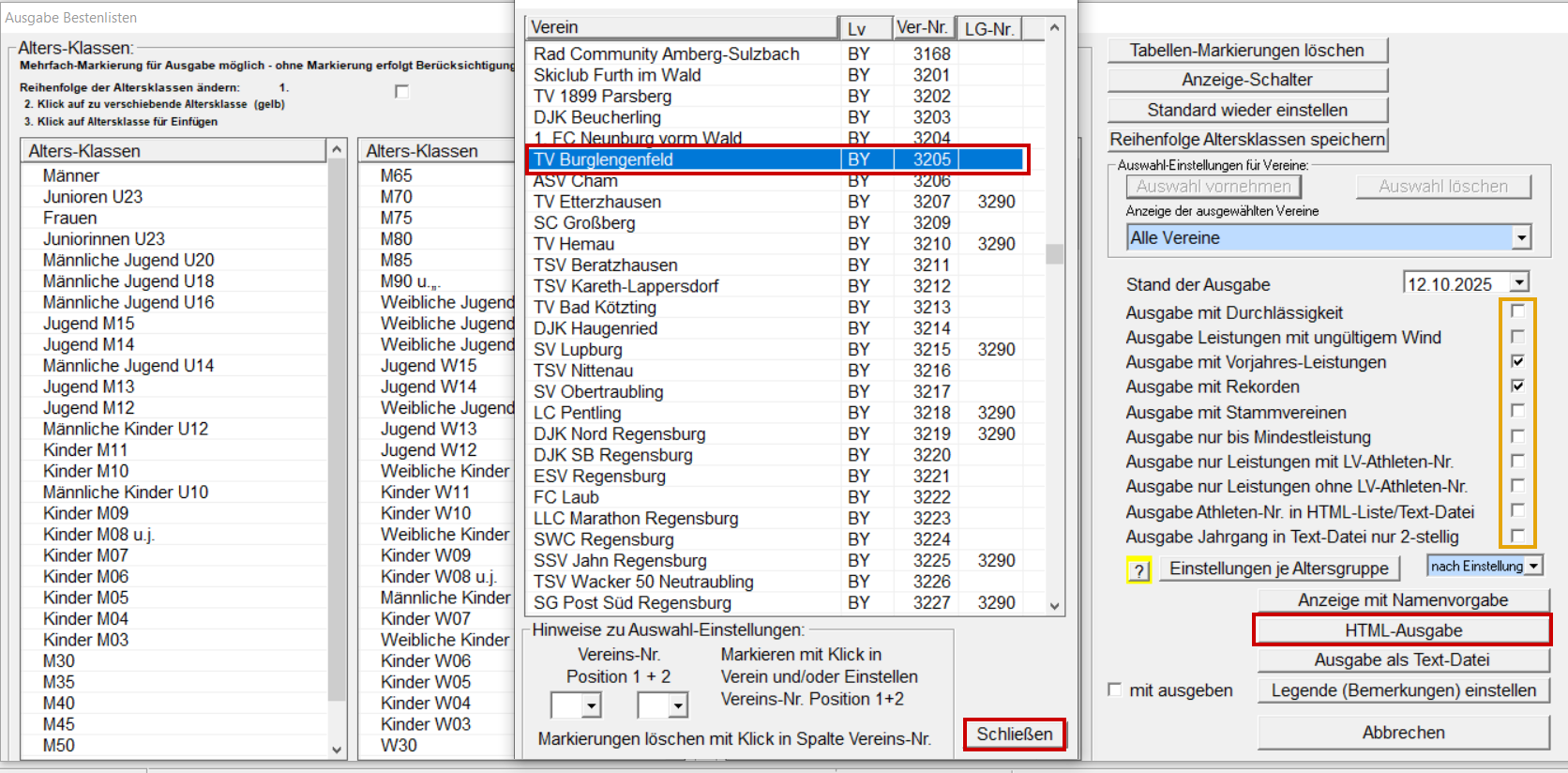 Listen / Bestenlisten öffnen Vereins "Auswahl vornehmen". TV Burglengenfeld markieren und schließen. Einstellungen vornehmen (gelbe Umrandung). Speicherort festlegen. HTML Ausgabe der Bestenliste.