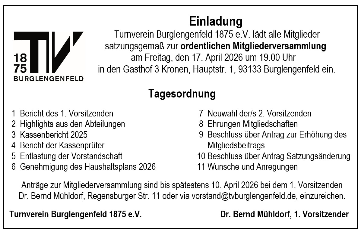 Einladung zur ordentlichen Mitgliederversammlung am 17.04.2026 um 19.00 Uhr