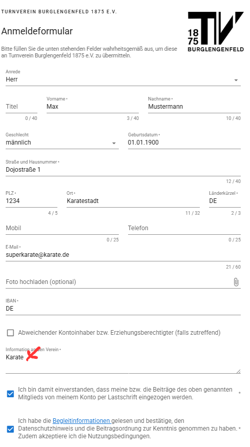 Hinweis: Bitte bei unserer Digitalen Anmeldung unter "Informationen an den Verein" die Abteilung mitteilen. Hier ein Beispiel. Sollten in der Karate Abteilung schon Familienmitglieder sein, dann schreiben Sie dies bitte dazu. Hier ein Beispiel.