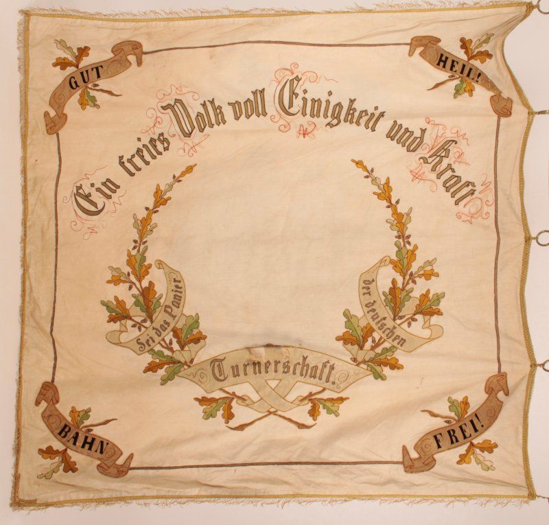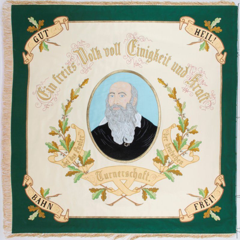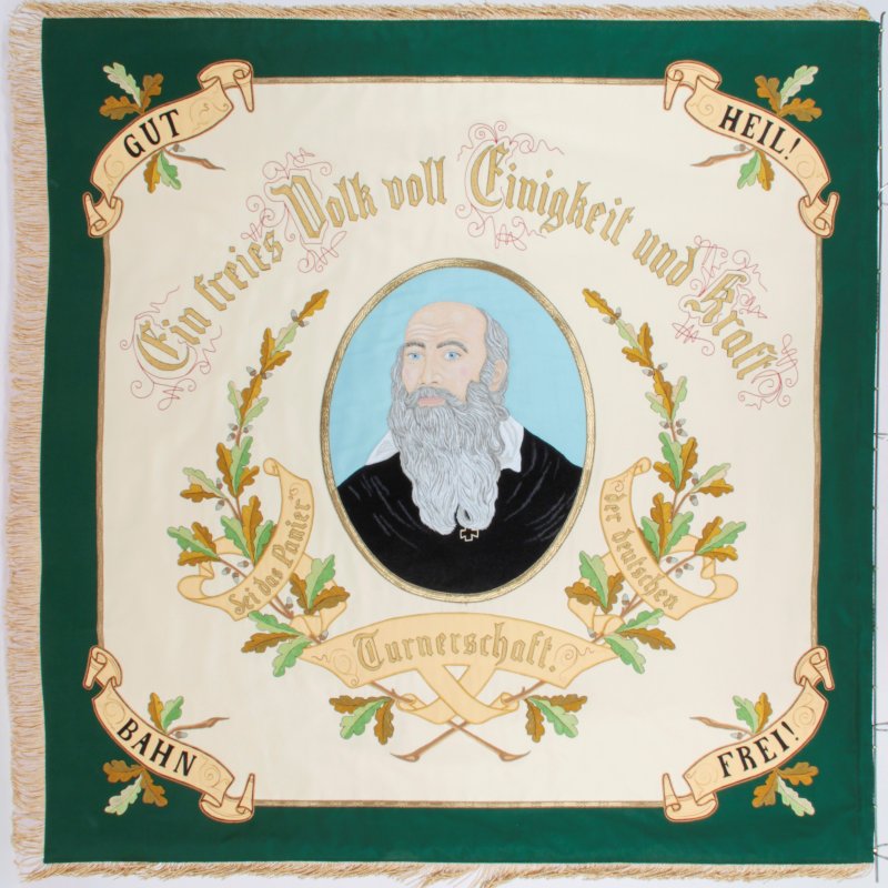 Wir haben daher die Firma Fahnen Kössinger gebeten unsere Fahne genauer zu begutachten. Die Experten vor Ort konnten uns erstaunliches über die Geschichte der Fahne berichten, es wurden sogar handschriftliche Notizen in altdeutscher Schrift unter dem Deckstoff gefunden. Leider ist fast nichts mehr vom originalen Grundstoff zusehen, dieser ist im Laufe der Zeit sehr porös geworden und abgefallen. Auf der „leeren Seite“ war definitiv ein Mittelbild abgebildet, höchst wahrscheinlich ein in Handmalerei gefertigtes Motiv, da man am oberen Ende des Schriftbandes noch feine Malereien zu erkennen waren. kann. Es ist sehr schade, dass dieses Motiv nicht mehr vorhanden ist und wir auch nach aktiver Recherche keinen Nachweis für das ursprüngliche Motiv finden konnten. Wir haben uns deshalb für den Turnvater Jahn entschieden, da dieser als wahrscheinlichstes Motiv auf alten Turn-Fahnen abgebildet ist.